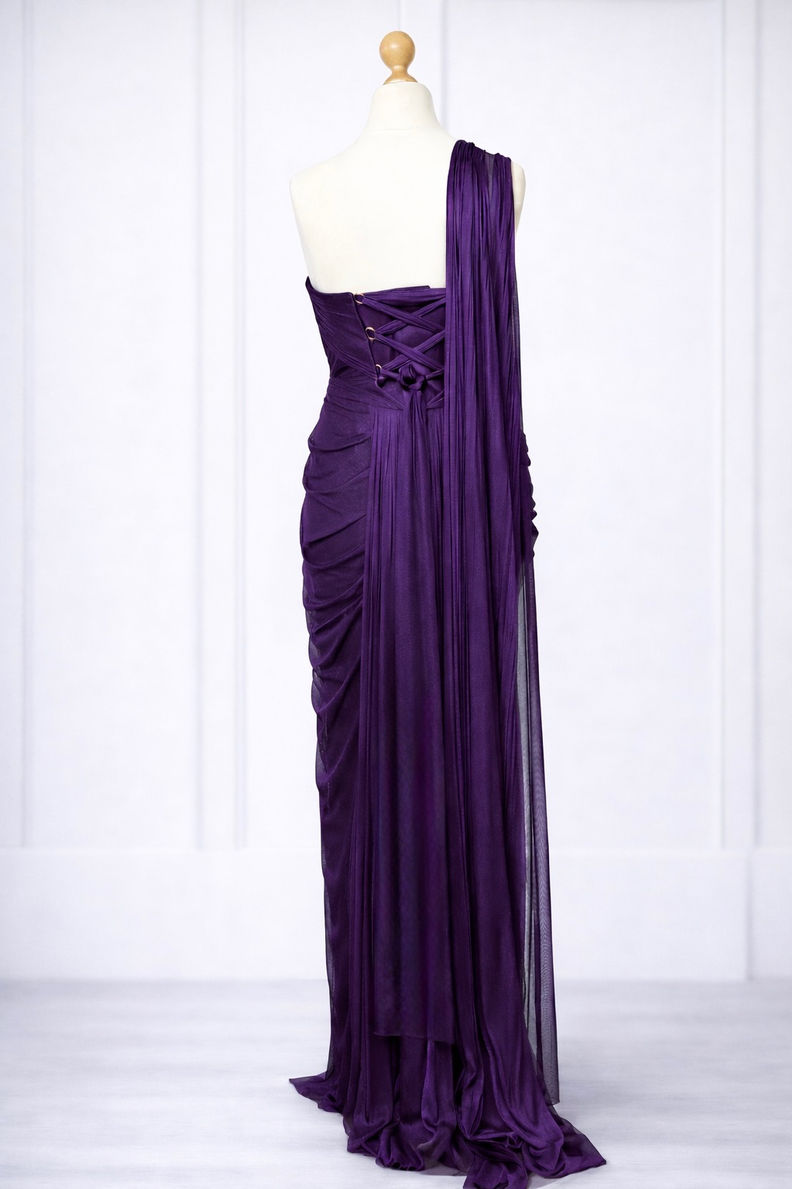 - Hand-sculpted draped bodice designed to shape and elongate the silhouette